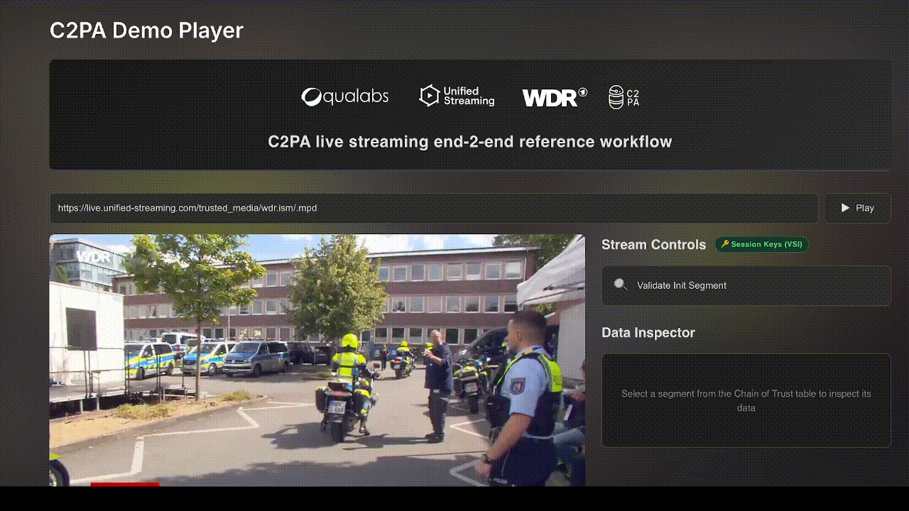 The starting point: Unified Streaming has one of the most powerful and widely adopted packagers in the industry, Unified Origin, trusted by major broadcasters and streaming platforms globally. Qualabs brought deep expertise in video workflows and open source standards implementation. And WDR, Germany's largest public broadcaster, contributed something equally valuable: broadcast content with full provenance metadata, organization, station ID, program name, grounding the demo in something the industry can recognize.